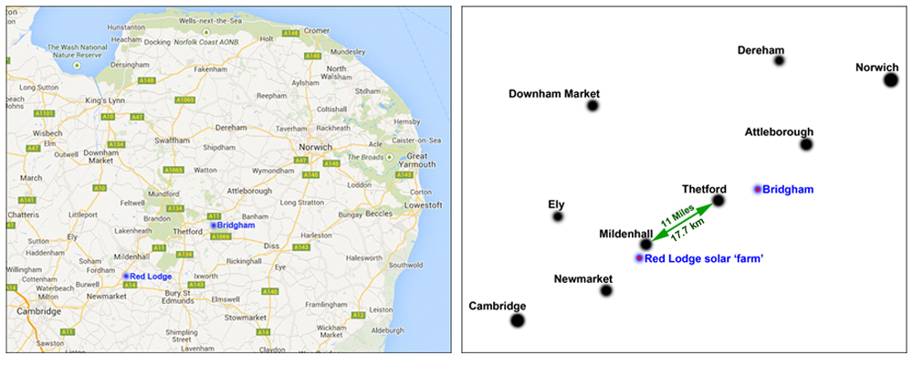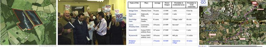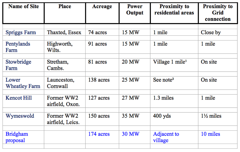 SIZE (MW) According to the Interactive Map of Renewable and Alternative Energy Projects in the UK, which lists major solar schemes in the UK, there are 102 schemes in operation, each generating between 1 and 35MW of electricity, and 70 schemes approved/in course of construction also generating between 1 and 35 MW. Of the total of 172 schemes, the vast majority (127) are small in size, each generating less than 6 MW. Only 12 generate 15 MW and over and only 2 generate more (35 MW) than the Bridgham scheme (30MW). It can be seen, therefore, that the Bridgham scheme is huge in relation to the vast majority of schemes; that is why its location is such an important consideration in determining this planning application. LOCATION IN RELATION TO RESIDENTIAL AREAS AND EASE OF CONNECTION TO THE NATIONAL GRID. Together with size, these are important factors to be taken into consideration. Paragraphs 8 and 12 of the new Planning Practice Guide for Renewable and Low Carbon Energy state that in considering locations, local planning authorities will need to ensure that they take into account, inter alia, but critically, the potential impacts on the local environment; also the proximity of Grid connection infrastructure and site size. In the Bridgham case, the local environment is the bucolic landscape of the River Thet valley and its village community of rural dwellers. The applicants themselves acknowledge the importance of location. They say that an ideal site for a solar farm should be away from residential areas and close to an electricity substation. On their website ReThink state that they always endeavour to adapt and update their project plans following public consultations to ensure they are not missing anything vital to the local community and that the local community is happy. They go on to say that whether they need to change their site location, adjust some of the layout, or ensure that they have tailored the construction plan to suit local priorities, they will always try to help. ReThink have not responded at all to the views of the community of Bridgham. I have examined the planning applications for the 3 largest solar farms in operation and the 3 largest approved or under construction. I have compared them with the Bridgham scheme in respect of their size in terms of acreage and power output, and their proximity to residential areas and a Grid connection. The comparisons are set out below. ![]() Notes: