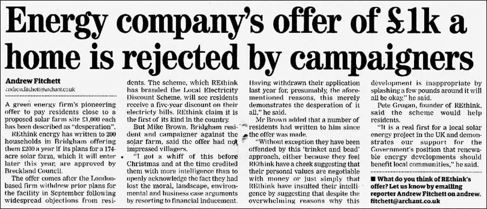 The key to ReThink Energy’s success is that we always work in consultation with local people and act sensitively to the needs of local residents, land owners and parish councils. A renewable energy project is for the benefit of the community first and for Britain second, and so the development of the project should be a seen as a partnership.* At ReThink, we pride ourselves on the collaborative nature of our development process, but before we even reach the stage at which a renewable energy project appears technically suitable for a given location, the site must undergo a rigorous series of assessments for suitability and pass a set of strict planning criteria. These assessments include, but aren’t limited to: • Landscape and Visual Impact Assessments, to ensure that local residents’ views will not be negatively impacted • Ecological assessments and wildlife surveys, to make sure that the proposed project wouldn’t disturb any animals or plants currently using the site • Archaeological Assessments, often including full geophysical surveys to ensure that nothing of archaeological interest would be disturbed by the project (Often our geophysical surveys provide the first opportunity for archaeologists to get an idea of what may lie below the land in question) • Flood Risk Assessments • Topographical Surveys • Access analysis for the short construction phase, to ensure that local traffic flow is not affected • Analysis of potential mitigation measures Following a successful screening using the methods mentioned above, ReThink Energy then begins community consultation. Although we are not required to discuss our proposals with the local community, much less act upon the feedback we receive, ReThink Energy places a huge amount of importance upon community consultation. We believe it’s vital to include input from the local community in the final design and layout of our projects. ReThink always endeavour to adapt and update our project plans following public consultations to ensure we’re not missing anything vital to the local community and that the local community is happy. Whether we need to change our site location, adjust some of the layout, or ensure that we’ve tailored the construction plan to suit local priorities, ReThink will always try to help." http://rethink-energy.co.uk/our-projects.html *Norfolk is over capacity for electricity, requiring new cables to be laid to Thetford, and it is London that needs this.