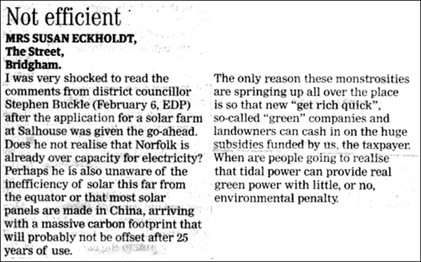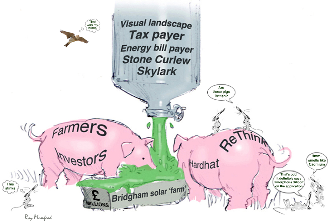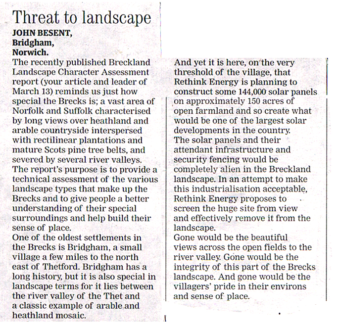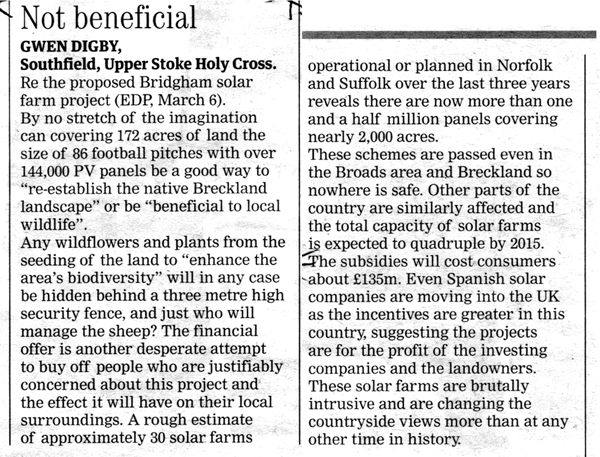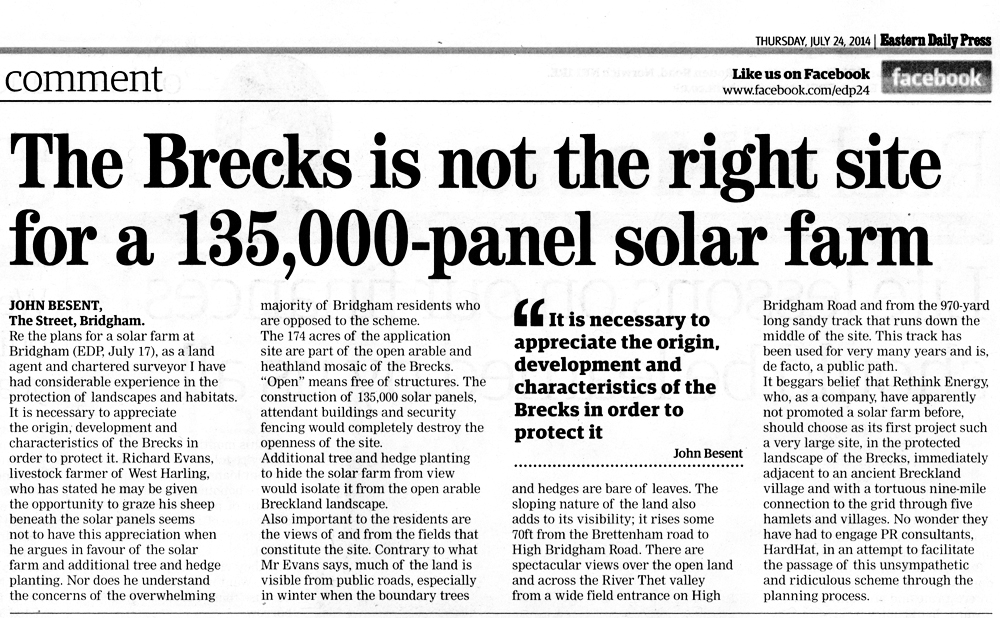 "Green projects can only be considered green if they do not detract unduly from the environment and its well being. Developments on the scale of, and sited in a location such as, the proposed solar farm at Bridgham cannot by any stretch of the imagination be viewed in a positive light; indeed, the cost to the local environment at Bridgham must surely far outweigh the benefit to the country. We