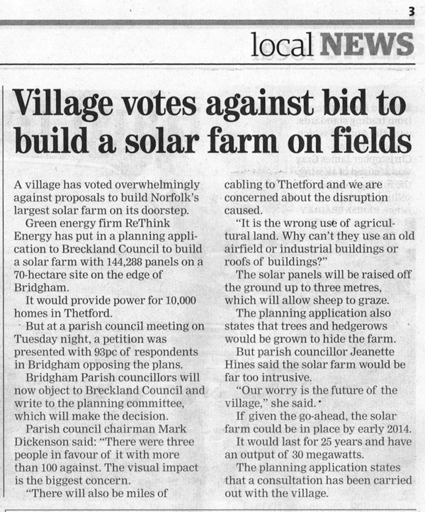 Updated 11th April 2025 This page tells the story of how a (now dissolved) company from Reading Berkshire were defeated by a small Norfolk villge. Bridgham village came together for over two years, to fight a plan for a massive solar plant right next to this ancient village.It would have meant good arable land ceasing to grow food and instead growing subsidies. (see below) Fortunately seven out of ten district councillors agreed with the village and rejected the plan. We care deeply about the environment and support the growth of re-newable energy. Britain is in the ideal position to use tidal energy - seabed turbines - totally predictable, dependable energy every day, regardless of whether the wind blows or the sun shines. (see below) Wind and solar also have their place, but solar should be on the roofs of houses, hospitals, factories, supermarkets etc. Located where it is needed as the losses of transporting that energy are great. (see below) If you are fighting a similar plan this page will almost certainly help you. It will show how doing your research and building your case can be effective. The battle comences at the bottom of this page and concludes at the top. The solar plant would have been the size of 87 football pitches. Covering nearly 170 acres with glass and plastic. This would be on productive farmland in beautiful Breckland countryside for at least 25 years. ![]() The story of the failed plan for Bridgham solar plant. This page has a lot of information, maps and photos detailing why the huge solar plant would have been totally inappropriate - please read on to